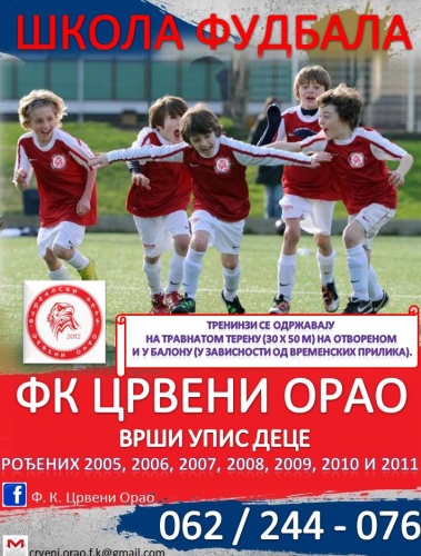 ФК Црвени Орао врши упис дечака и девојчица од 5 до 16 година. Упис се врши током целе године. О условима и детаљнијим информацијама о упису детета у школу фудбала која ради у оквиру фудбалског клуба можете добити на телефон: 062 / 244 - 076 (Владимир Марковић).